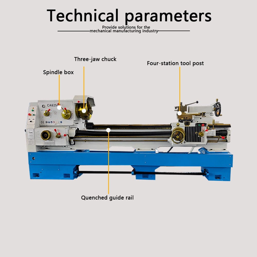 3. The machine tool rest with single motor turning cylinder, you can also use the tool rest and longitudinal feed turning cone length.The machine it is suitable for large and medium-sized of steel and non-ferrous metal parts processing, can be cylindrical turning, inner hole, face cutting, drilling, boring and nesting.