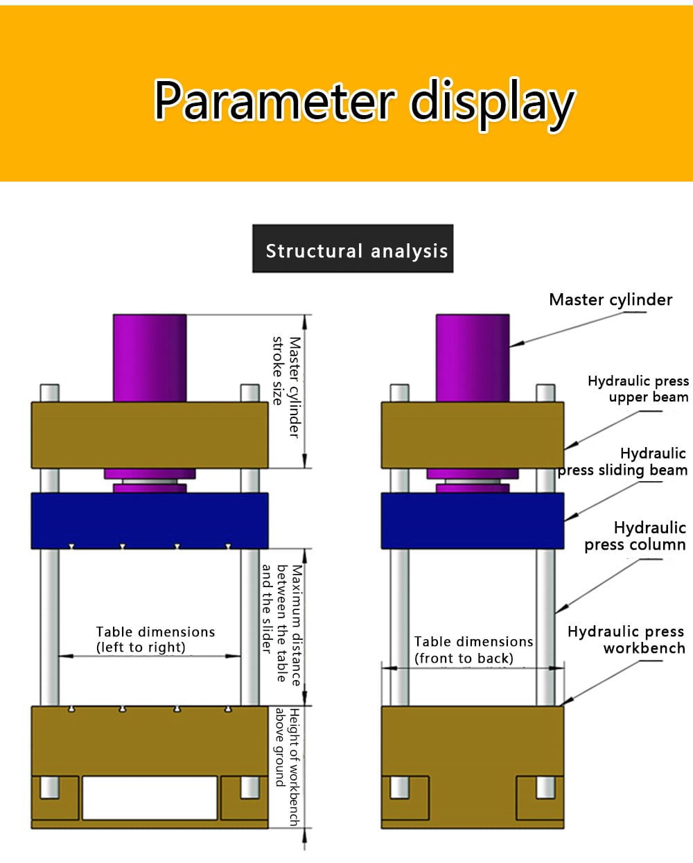 The effective dimensions of the hydraulic press are: the distance between the left and right sides, and the distance between the front and back edges. The size of the workbench is determined based on the external dimensions of different products (molds). When a hydraulic press simultaneously presses (stretches) different sizes, it is determined based on the maximum size of the product (mold). In theory, the size of the product (mold) accounts for 70% -80% of the effective size of the workbench, and the specific situation is according to customer requirements.